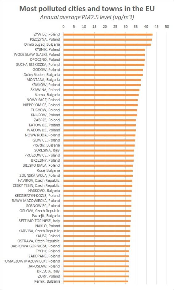 For years, the environmental health dangers of Poland’s coal industry have been documented: Poland’s coal mining industry plays a large role in the country’s pollution crisis. A 2014 air quality report from the European Environment Agency, singled out Poland and coal burning as leading contributors to air pollution in Europe. The same year, the WHO warned that air pollution is “the single biggest environmental health risk.” Now, 33 of the 50 most polluted cities and towns in the Europe Union are in Poland, according to the WHO, earning the country the moniker the “continent’s capital of smog.”